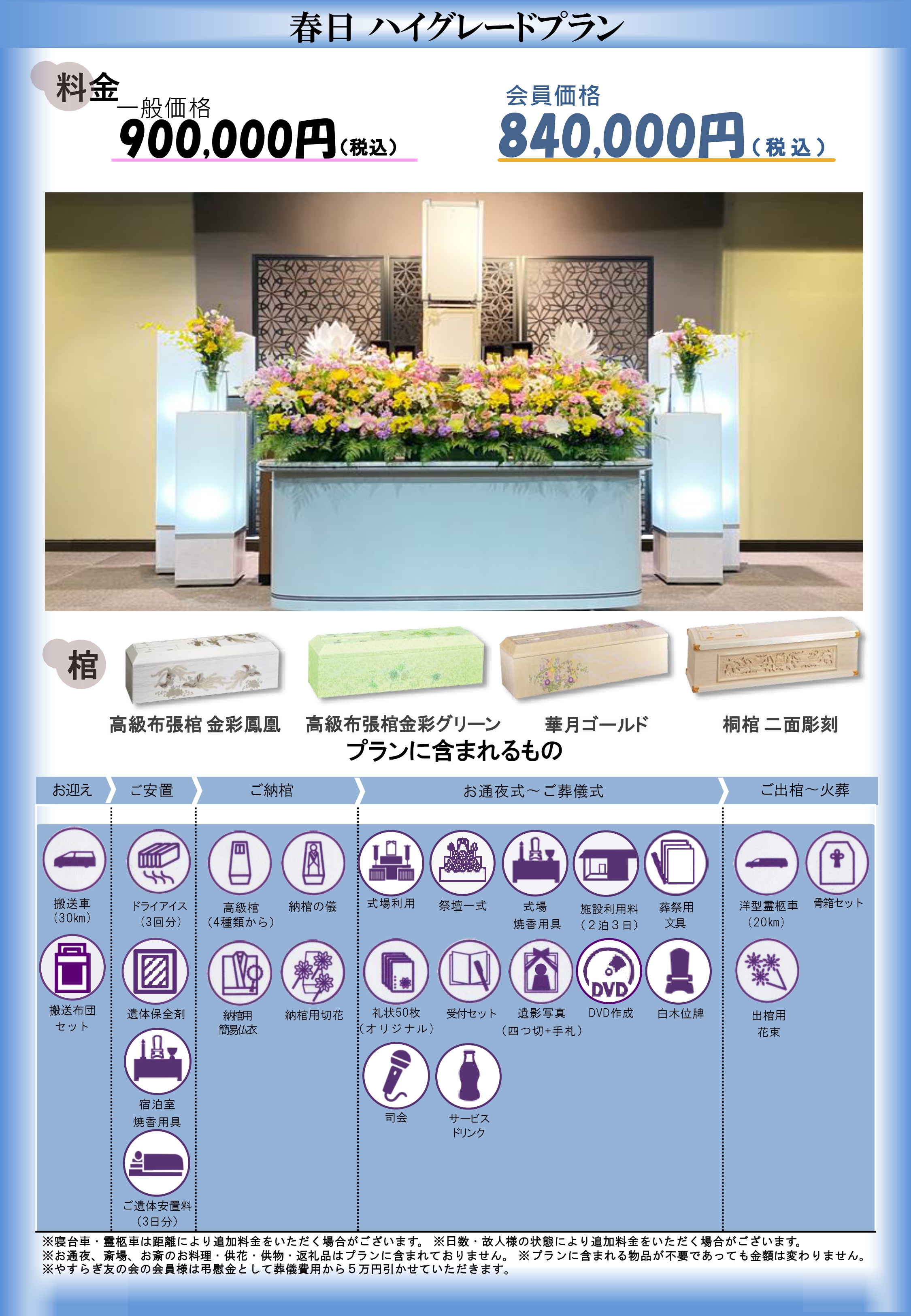 大和会堂『家族葬ホール春日』では5つのプランをご用意しております。各プランともに、施設利用料(2泊3日分)・祭壇料・式場使用料が含まれています。 プレミアムプラン ハイグレードプラン スタンダードプラン ベーシックプラン シンプルプラン ページ先頭へ↑ ページ先頭へ↑ ページ先頭へ↑ ページ先頭へ↑ ページ先頭へ↑ その他、神式葬儀プランもご用意しています。 電話:0120-04-1983